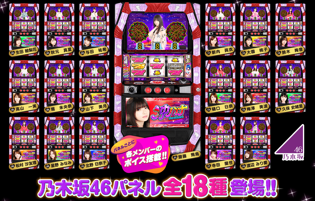 引用元:遊技日本本機では、天国ループ中のボーナスはすべてBIGボーナスで、最上位モードのループ率は約90%となっており、5号機の”沖スロ”に代わる最高峰のスペックを実現させた。また、「連続花火システム」を搭載しており、シンプルでありながらモードを推測しながらボーナスを目指すという奥深いゲーム性にもなっている。BIG終了後は99Gまでが天国ループのチャンスとなり、REG後なら32Gがチャンスだ。さらに、国民的人気アイドルグループ「乃木坂46」が遂にパチスロで登場する。メンバー18人がパネルデザインとして登場し、それぞれの撮りおろしボイスや乃木坂46の人気楽曲「裸足でSummer」、「ダンケシェーン」も収録している。