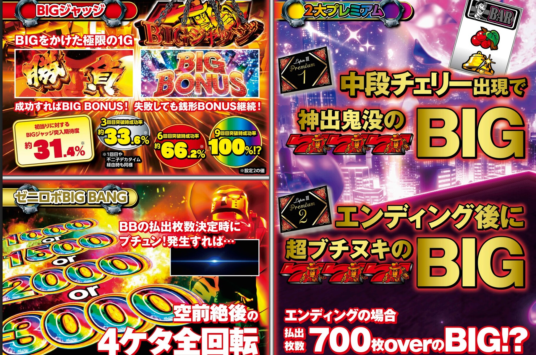 引用元:https://x.com/TT19751/status/1952718801432408549L主役は銭形5(オリンピア)10月上旬 10,000台純増:7.0枚ベース32.2G/50枚単価:4.4円MY:4,449枚ATTY:628枚天井:1250G(不二子デカタイム50%)リセット天井:850G設定/AT/出玉率②1/425 97.9%③1/416 99.0%④1/388 103.2%⑤1/376 107.1%⑥1/301 112.1%↑設定⑥だけ別格メイン小役 15枚▼通常時規定G数 ボーナス抽選ポイント CZ抽選デカ目 直ボーナス・前兆&ポイント高確ゼニガタイム▼規定G数通常A 天井1250G通常B 天井950G通常C 天井550G天国 天井150G▼CZ(9G)チャンスは4回リプでチャンスキャラ対応役なら成功濃厚一味の誰かを逮捕で成功不二子なら不二子デカタイム期待度50%▼ボーナス(銭形ボーナス)払い出し枚数100枚2回目以降100~3000枚(平均300枚以上)消化中はポイントでST(デカタイム)に有利なアイテム獲得抽選・アイテム手錠→STゲーム数減算ストップサーチライト→ST中対応レア役追加3G連チャレンジ→ボーナス終了後、3G連チャレンジへ不二子デカタイム→次回不二子デカタイム▼ST(デカタイム)10G+α 継続率59%レア役&デカ目 1/14.6非対応レア役でも33.6%対応役・強チェ・デカ目はボーナス濃厚引けなくてもラストジャッジあり▼上位ATのCZ(BIGジャッジ)突入条件・デカタイム3、6、9回目ボーナス当選で必ず突入・デカタイム1回目、強チェやデカ目で成功した場合は33.6%で突入・不二子デカタイム中、強チェやデカ目で成功した場合は必ず突入・1Gジャッジ3回目ボーナス後 33.6%※1回目、不二子デカタイム後も同様6回目ボーナス後 66.2%9回目ボーナス後 100%▼上位AT平均650枚×80%ループ突入時期待枚数2200枚▼ゼニロボBIG BANGST中レア役、デカ目で継続時の20%で突入4桁枚数上乗せ1000150020003000ベースのゲーム性はトラブルダークネス、上位ATへの入り口が多彩になっている設定⑥はエクストラっぽい